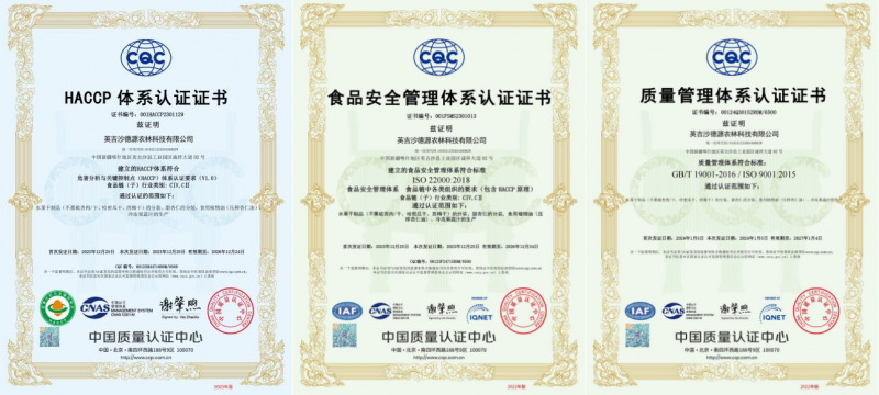 小小的我,本着“一切逃求高质量、高质量、用户对劲为旨”的,以“殷勤的办事、靠得住的产质量量”为准绳,确保食物平安的奉行。目前,德源农林曾经成功通过ISO9001质量办理系统认证、ISO22000食物平安办理系统、HACCP风险阐发取环节节制点系统认证。